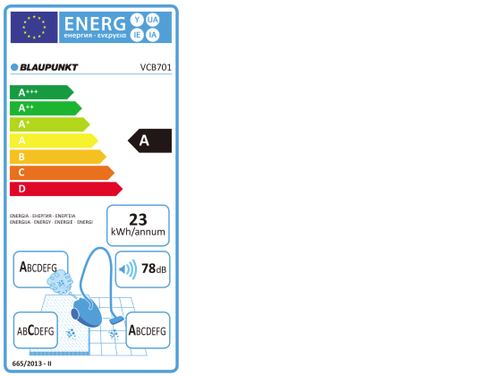 VCB701 вирізняється Клас енергоспоживання А що означає, що пилосос має дуже високу продуктивність прибирання при низькому енергоспоживанні. DpuHF клас A означає, що на твердій підлозі пилосос збирає до 111% пилу. У найефективніших моделях цей показник зазвичай перевищує 100%, оскільки під час прибирання пилосос також збирає пил з поверхонь, прилеглих до швабри.