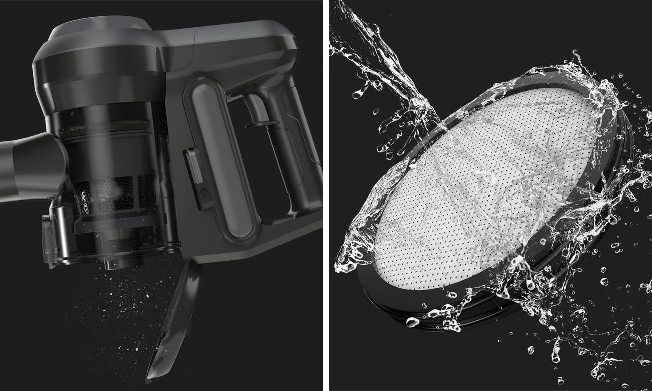 Главное преимущество пылесоса Aeno SC1 - отсутствие мешка. Вместо бумажного или тканевого мешка здесь установлен пластиковый контейнер объемом 500 мл, который&oac;легко вынимается, высыпается в контейнер и затем моется. Никакой пыли, пролитой жидкости или неприятного запаха. Легкое извлечение фильтра является дополнительным преимуществом пылесоса Aeno SC1. Кроме того, для очистки фильтра от грязи и пыли достаточно провести по нему струей проточной воды.
