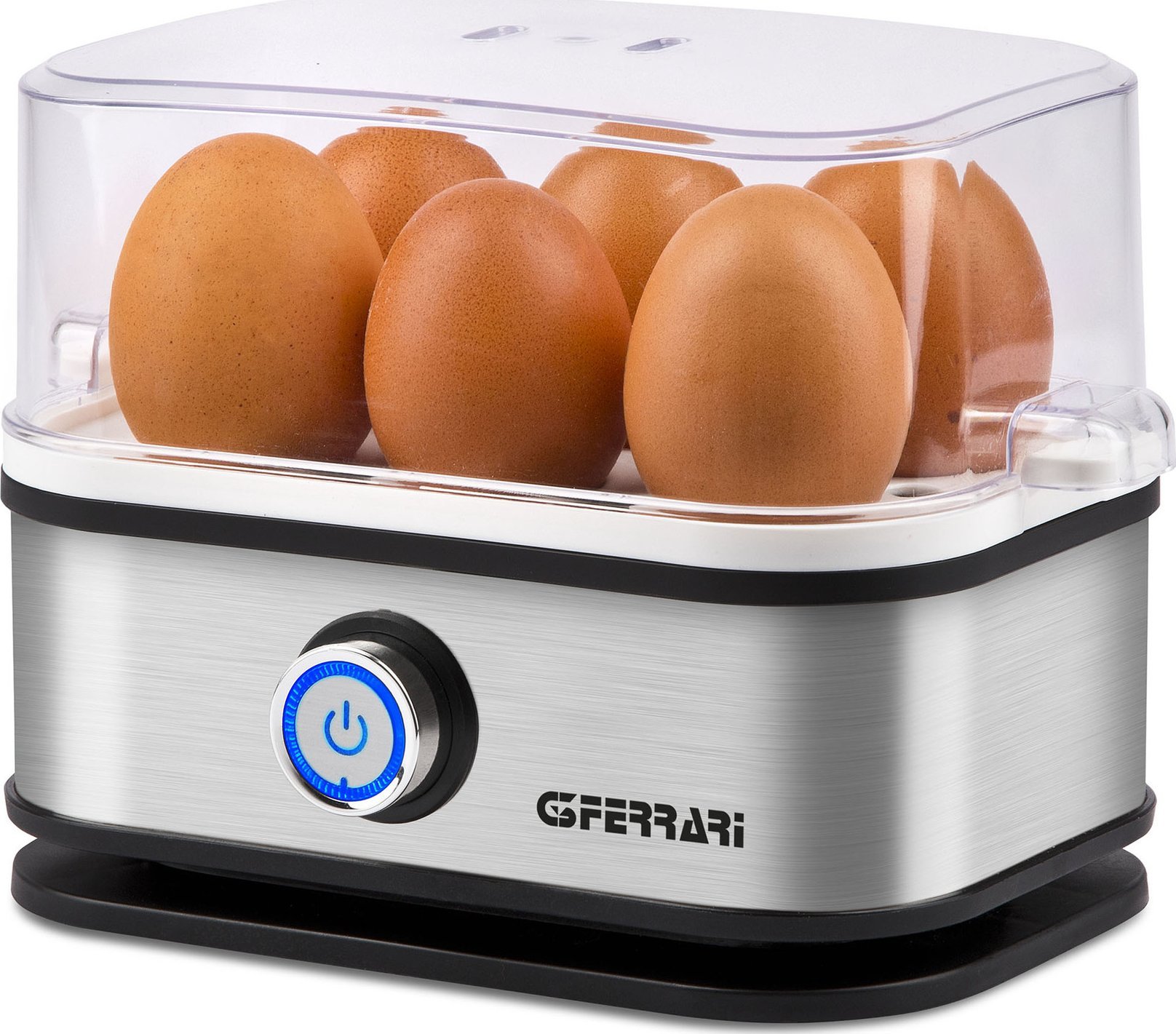 яйцеварка, потужність 400 Вт, приготування на пару до 6 яєць, варильна поверхня з нержавіючої сталі, кнопка увімкнення/вимкнення з індикатором живлення, корпус з нержавіючої сталі, втягувач кабелю, нековзні ніжки, живлення: змінний струм 220-240 В ~ 50-60 Гц