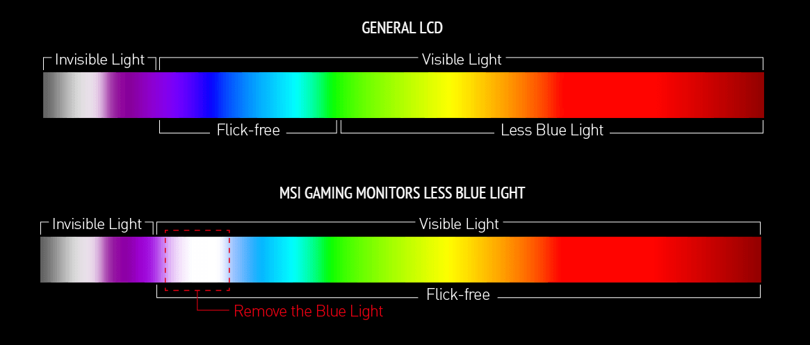 Дисплеї стандартних моніторів зазвичай мають частоту мерехтіння близько 200 разів на секунду, що непомітно для неозброєного ока, але може спричинити втому з часом. Технологія MSI Anti-Flicker забезпечує дуже комфортний візуальний досвід, зменшуючи кількість мерехтінь.