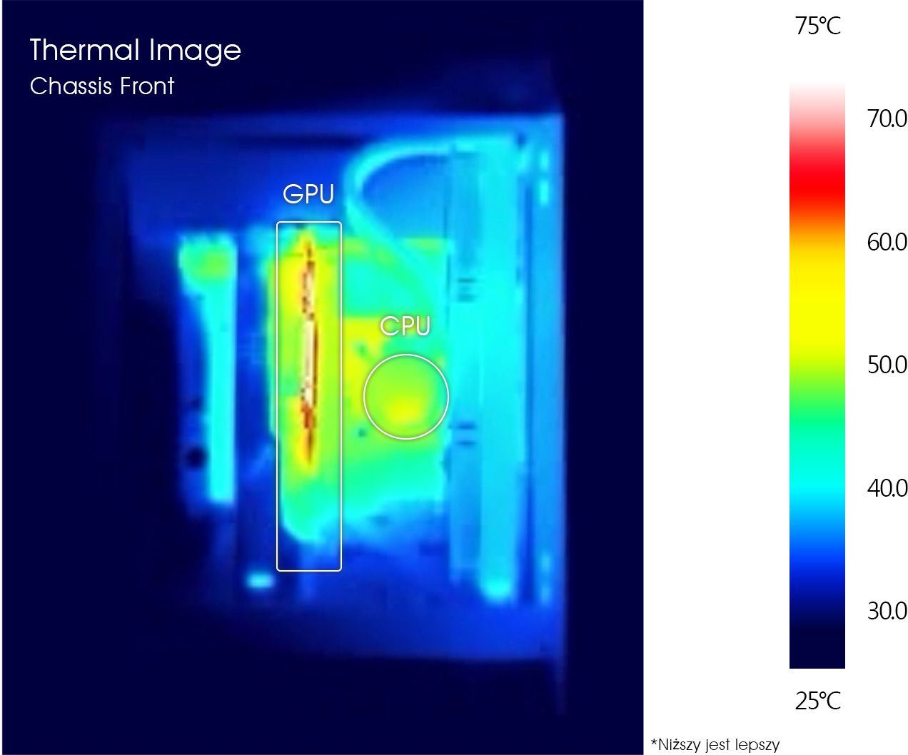 Під час теплового тестування були зроблені тепловізійні знімки. Як ви можете бачити на зображеннях нижче, ми змогли переконатися, що впускні отвори для холодного повітря та випускні отвори для гарячого повітря були добре спроектовані та забезпечували стабільну температуру комплекту в будь-який час.