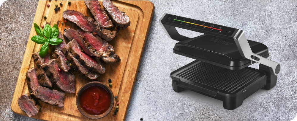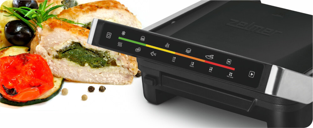 Електричний гриль ZELMER ZPR2600 - це все про легке приготування їжі на грилі. Ми оснастили його 6 автоматичними програмами. Використовуючи їх, ви легко приготуєте бургери, курку, сендвічі, сосиски, м'ясо та рибу. За допомогою кольорових індикаторів ви будете знати, на якому етапі програми знаходиться ваша страва. Якщо ви віддаєте перевагу рибі або м'ясу з кров'ю або підсмаженому, ви можете вибрати один з 4-х рівнів обсмажування. Електронне управління гарантує, що ваша їжа буде приготована саме так, як ви любите. З іншого боку, якщо ви віддаєте перевагу контролювати процес приготування їжі самостійно, використовуйте ручний режим. Ви самі вирішуєте, як довго ви хочете, щоб гриль нагрівався. Іноді ви можете забути заздалегідь дістати продукти з морозильної камери. Однак, завдяки функції розморожування для нашого гриля, це не проблема. У повсякденному використанні ви неодмінно оціните можливість знімати тарілки і мити їх безпосередньо в посудомийній машині. Для вашої безпеки ми оснастили гриль ручкою, що не нагрівається, та нековзними ніжками, які водночас захищають поверхню, на якій ви встановлюєте гриль, від надмірного нагрівання.