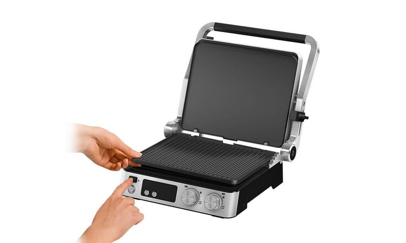 | Додаткова інформація | 2 незалежні ручки для встановлення окремої температури на пластинах; Блокування кришки; Спеціальний додаток; Можна мити в посудомийній машині; Ручка з антипригарним покриттям; Антипригарне покриття гриля; Корпус з нержавіючої сталі; Дисплей; Знімний піддон |