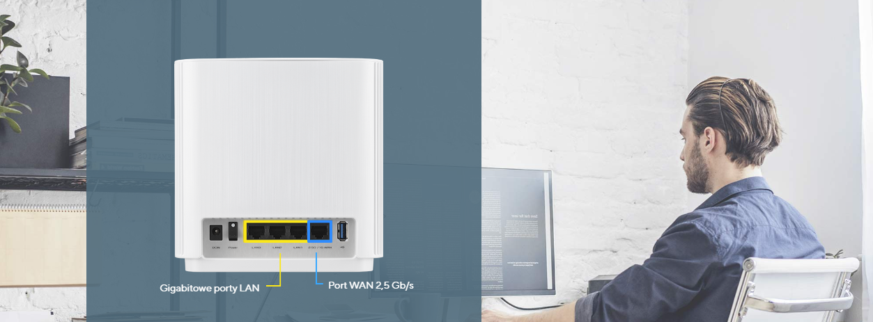 Завдяки WAN-порту 2,5 Гбіт/с маршрутизатор ASUS ZenWiFi XT9 дозволяє максимально використовувати швидкість 2,5 Гбіт/с, пропоновану інтернет-провайдерами для сумісних дротових пристроїв. Ви також можете насолоджуватися швидкістю дротового з'єднання до 2 Гбіт/с за допомогою функції агрегації каналів LAN.