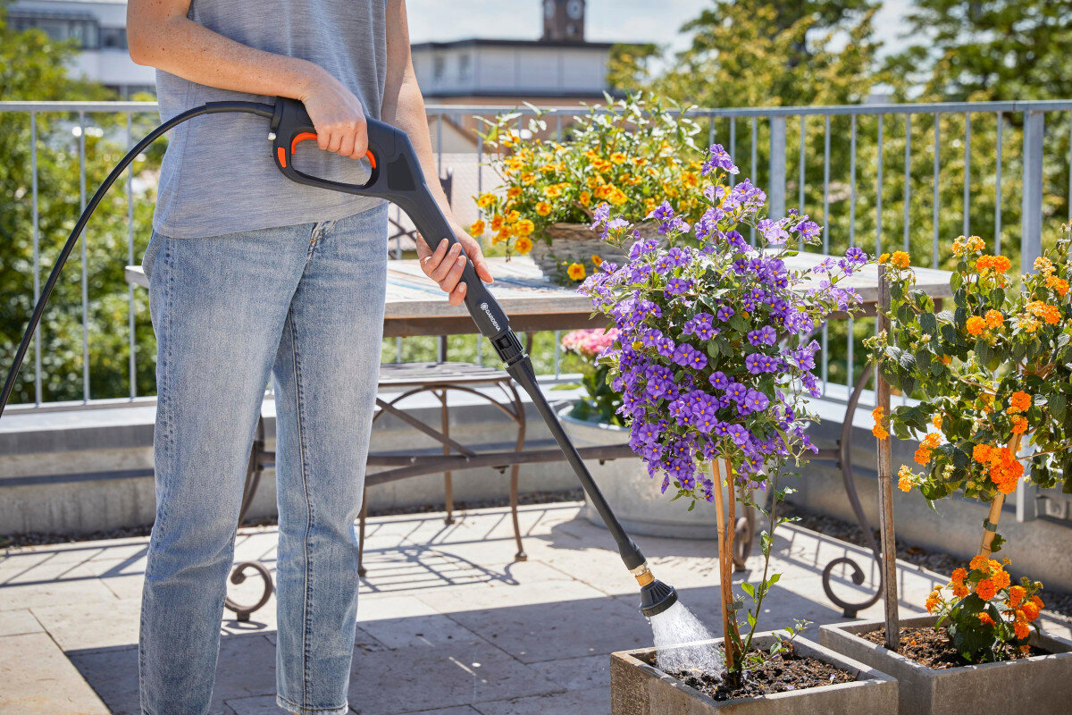 Просто підключіть пістолет-розпилювач, що входить до комплекту, щоб перетворити мийку GARDENA AquaClean Li-40/60 на мобільний зрошувальний пристрій. Наповніть бак для води і візьміть її в кожен куточок саду, щоб полити рослини.
