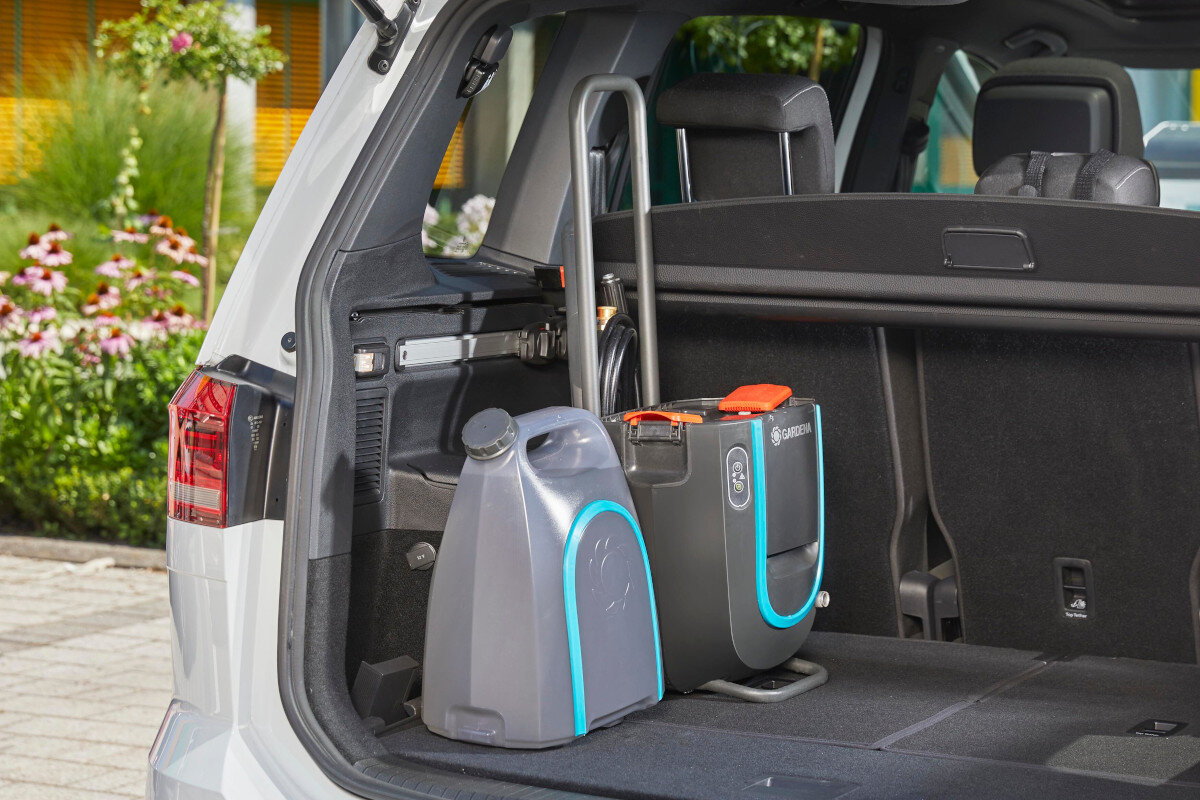 Пральна машина оснащена знімним баком для води, який вміщує близько 14 літрів. Якщо цього недостатньо, за допомогою вбудованого з'єднання для шланга GARDENA ви можете під'єднати шланг і підключитися безпосередньо до джерела води.