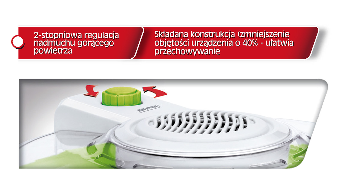 Не потрібно турбуватися про зберігання MSG-06 дегідратор для харчових продуктів. Ця модель має складну конструкцію - послідовні сита можна вставляти одне в одне, таким чином зменшуючи об'єм приладу на 40%. Ви можете легко помістити прилад у кухонну шафу.