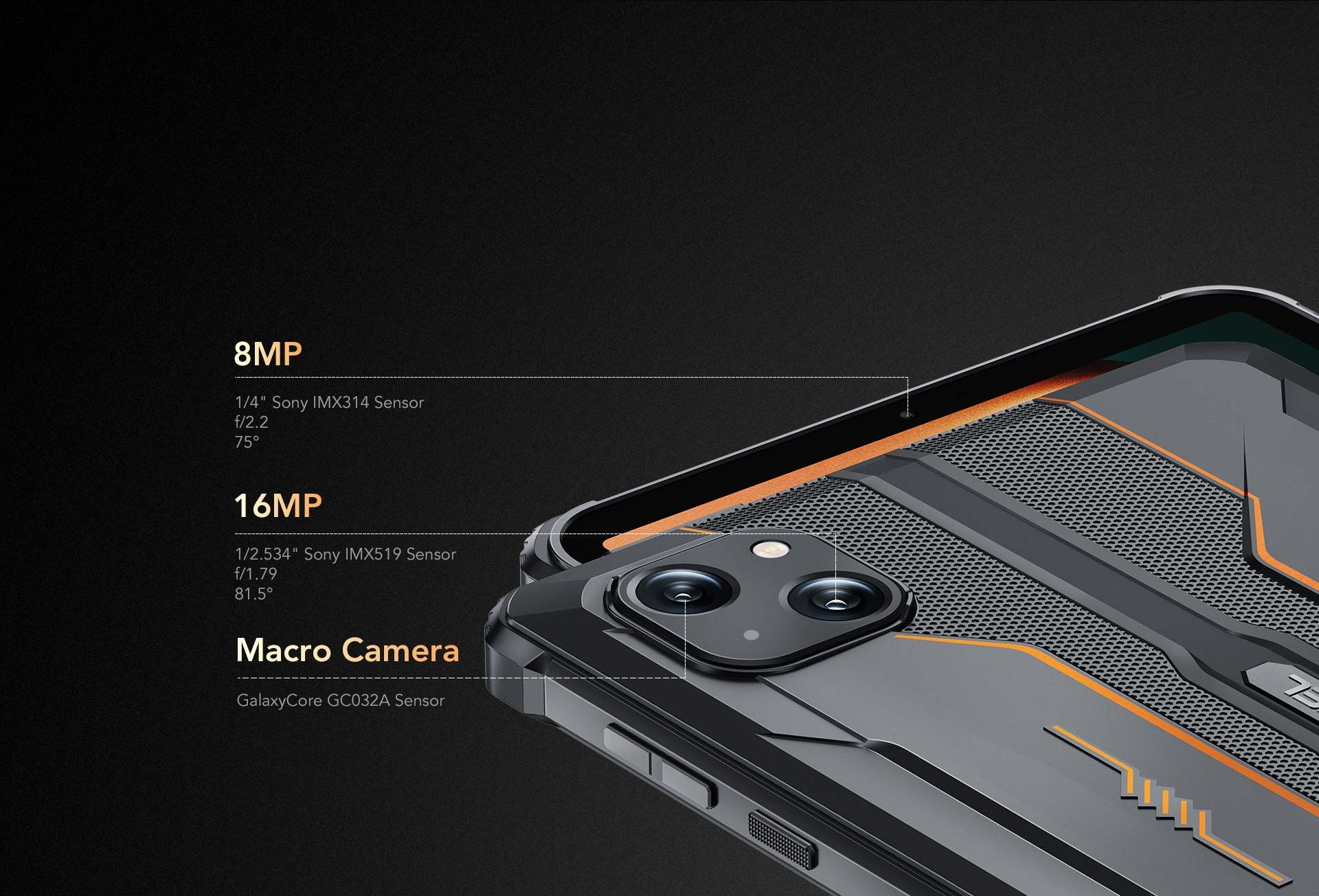 Завдяки сенсору Sony IMX519, діафрагмі f/1.79 та світлодіодному спалаху основна камера з роздільною здатністю 16 МП дозволяє робити приголомшливі фотографії або фіксувати пам'ятні моменти при будь-якому освітленні. Завдяки сенсору Sony IMX314 та діафрагмі f/2.2 фронтальна камера на 8 МП дозволяє робити чудові автопортрети та забезпечує відмінну чіткість під час відеодзвінків. Ви також можете вибрати один з декількох режимів зйомки, включаючи Beauty, Pro, Mono, Bokeh і QR-код. Міцна конструкція дозволяє знімати чудові моменти навіть в екстремальний холод чи спеку.