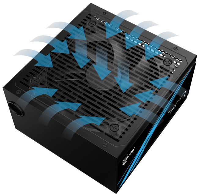Збільшена площа вентиляційних отворів у корпусі БЖ забезпечує кращу циркуляцію повітря, запобігаючи перегріванню системи. Тихий 12-сантиметровий вентилятор чорного кольору з оптимізованим регулюванням швидкості обертання. Вентилятор працює зі стартовою швидкістю (менше 800 об/хв) до досягнення 60% навантаження при температурі навколишнього середовища 25 ℃.