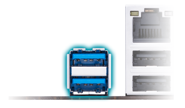 Численні порти USB підтримують висококласні комплекти з периферійними пристроями, зокрема роз'єми USB Type A на задній панелі з високошвидкісним інтерфейсом USB 3.2 Gen 1 для підключення до сумісних корпусів.