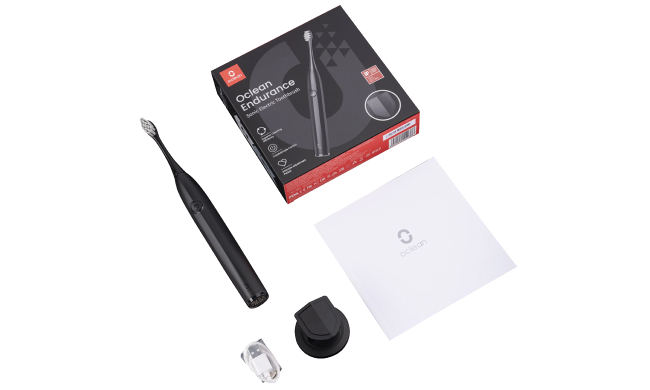 У комплекті зі звуковою зубною щіткою Oclean Endurance Color ви знайдете: насадку, кабель USB-C для зарядки, настінний кронштейн та інструкцію користувача.