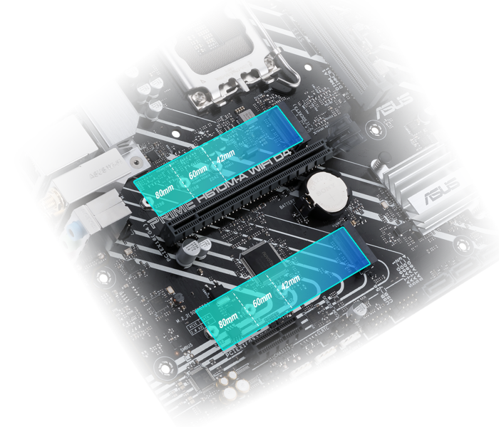 PRIME H610M-E D4 має два слоти M.2, що підтримують швидкість передачі даних до 32 Гбіт/с через PCIe 3.0, забезпечуючи прискорення завантаження операційної системи або дисків із додатками.