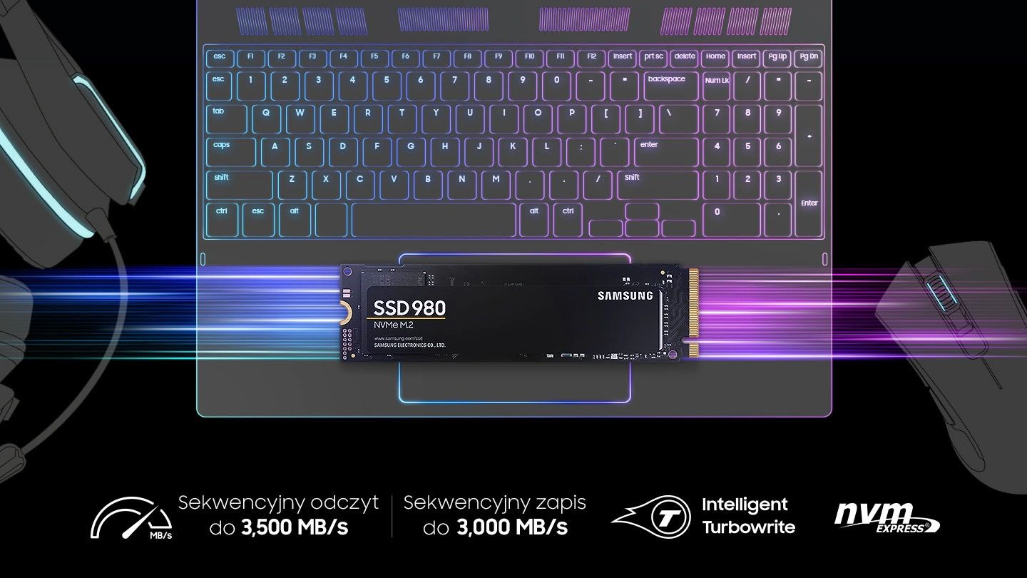 Миттєва продуктивність. Накопичувач 980 використовує майже всі переваги швидкості, які надає PCIe 3.0, завдяки технології HMB і чудовій продуктивності NVMe. Конструкція без DRAM забезпечує виняткову продуктивність, завдяки чому швидкість послідовного читання/запису досягає 3500/3000 МБ/с, що в 6,2 рази швидше, ніж у твердотільних накопичувачів SATA.