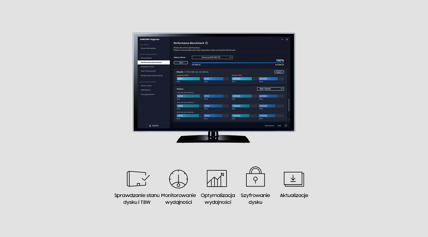 Відкрийте для себе всю потужність 980-го диска за допомогою інтуїтивно зрозумілих, але просунутих інструментів оптимізації, які пропонує Samsung Magician. Відстежуйте стан накопичувача, оптимізуйте продуктивність, захищайте цінні дані та отримуйте важливі оновлення, щоб ваш SSD завжди працював на 100% своєї ємності.