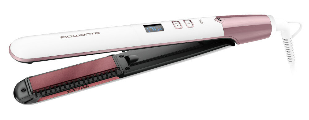 Насолоджуйтеся винятковими результатами випрямлення та об'ємною зачіскою з випрямлячем для волосся потрійної дії Rowenta Volumizer SF4655! Закруглені краї та вбудована щітка з натуральної щетини дозволяють піднімати та укладати волосся біля коріння, а система плаваючих пластин дозволяє регулювати тиск відповідно до товщини пасма волосся для досягнення найкращих результатів випрямлення одним рухом. Покриття з рожевого кварцу з функцією іонізації гарантує надзвичайно гладке та блискуче волосся, яке не електризується.