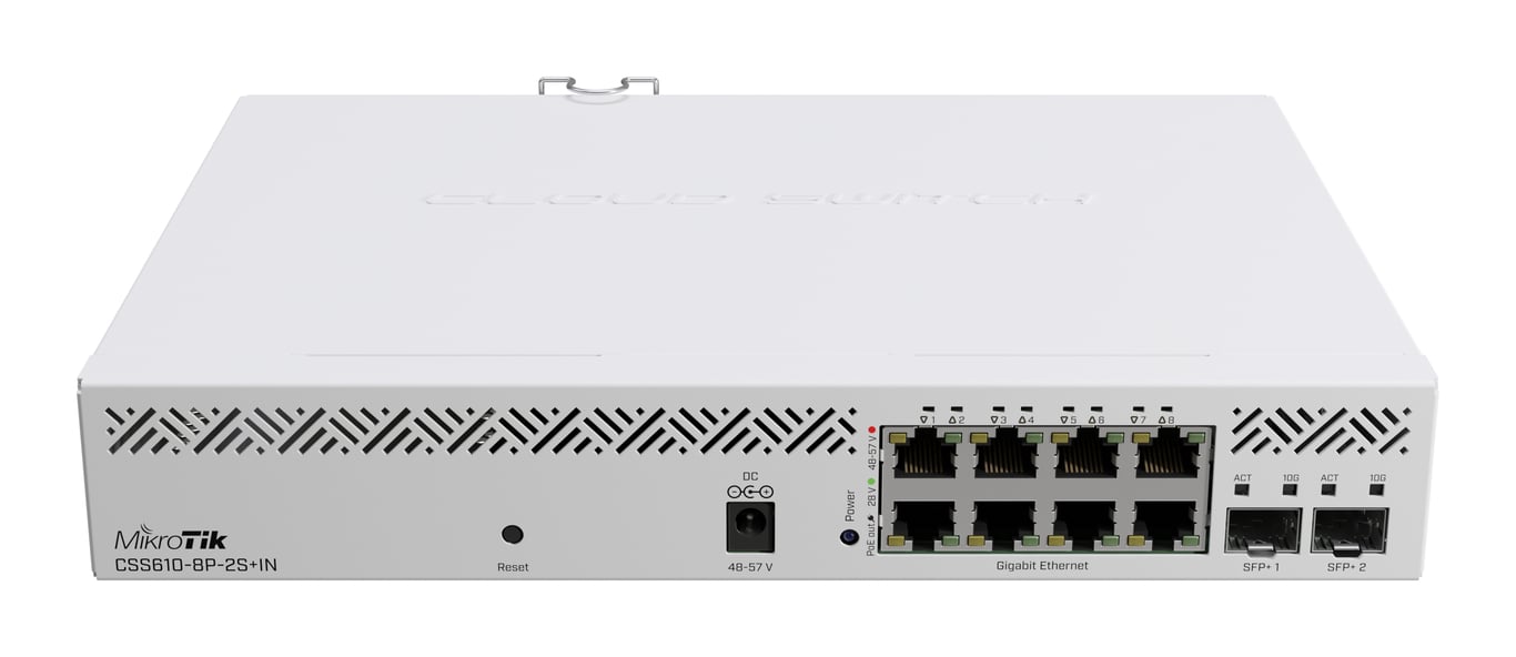 Mikrotik CSS610-8P-2S+IN. Тип комутатора: Керований. Основні комутаційні порти Ethernet RJ-45 Тип портів: Gigabit Ethernet (10/100/1000), Основні комутаційні RJ-45 Кількість портів Ethernet: 8, Кількість встановлених SFP+ модулів: 2, Пропускна здатність маршрутизації/комутації: 56 Гбіт/с. Стандарти зв'язку: IEEE 802.3af, IEEE 802.3at. Вхідна напруга постійного струму: 48 - 57 В. Підтримка PoE. Можливість монтажу в стійку