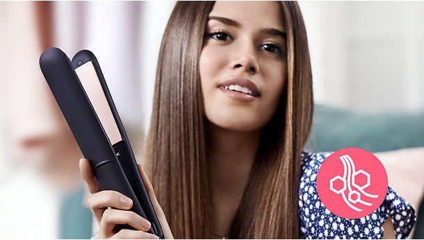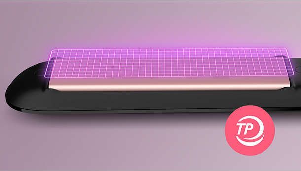 Технологія ThermoProtect рівномірно розподіляє тепло між пластинами, запобігаючи перегріванню та захищаючи волосся. Негативно заряджені іони запобігають утворенню статичної електрики, покращують стан волосся і розгладжують кутикули, надаючи волоссю красивого блиску. В результаті волосся стає прямим, гладким і блискучим.