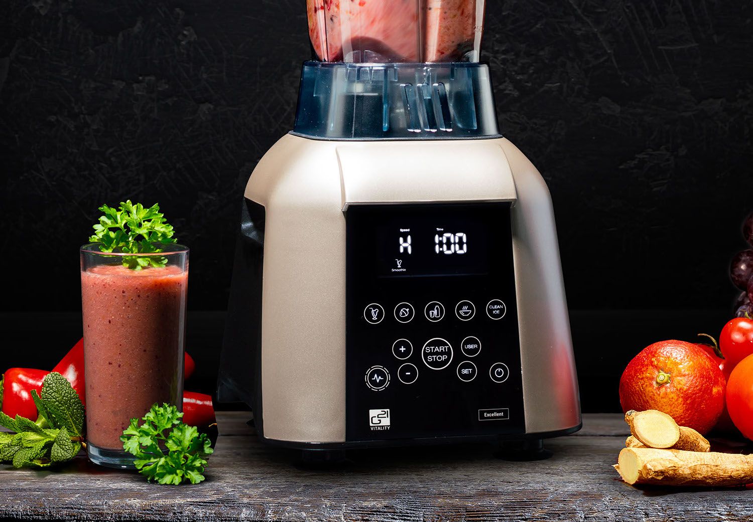 Блендер G21 Excellent має дуже зручну панель управління з дисплеєм. Вона дає можливість використовувати попередньо запрограмовані програми або програмувати власні, а також використовувати швидку програму або імпульсну функцію На панелі управління є п'ять програм для різних продуктів. Програма для смузі, горіхового молока, горіхів, супу та подрібнення льоду. Запуск блендера - це лише питання вибору потрібної програми та натискання кнопки СТАРТ. Програми передбачають не тільки час змішування, але й зміну швидкості під час програми для досягнення найкращого результату. Новою функцією є програма користувача, яка дає можливість зберегти до 6 власних налаштувань ефектів. G21 Excellent також надає можливість змішування за допомогою швидкої програми, яка передбачає самостійне налаштування швидкості та часу роботи.