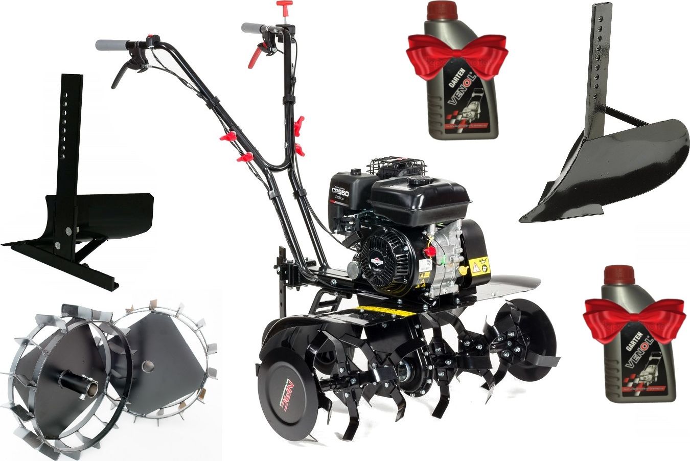Тип двигуна: двигун внутрішнього згоряння, чотиритактний, верхньоклапанний. Виробник двигуна: Briggs & Stratton. Модель двигуна: CR950. Об'єм двигуна: 208 см3. Максимальна потужність двигуна: 6,5 К.С. Максимальна робоча ширина: 80 см. Максимальна робоча глибина: 32 см. Кількість робочих зірок: 6 (3+3). Кількість прополювальних ножів: 24. передня передача: так. Задній хід: так. Бічні диски для захисту рослин: так. Кількість опорних коліс: 2 ззаду. Комплектація: металеві колеса, плуг, ландшафтний розпушувач, моторне масло.