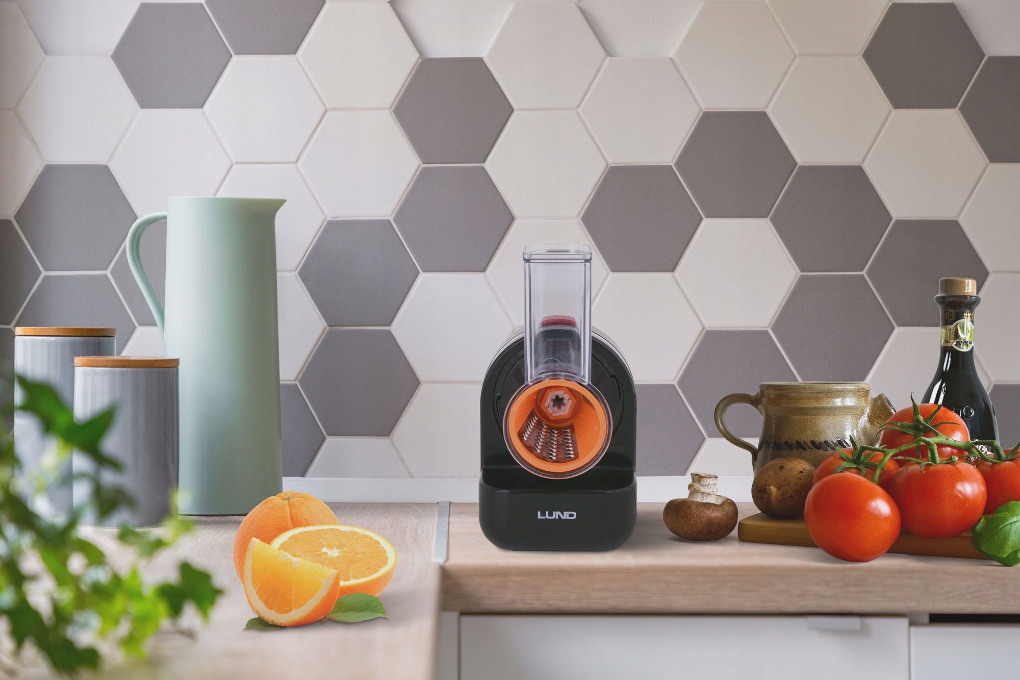 ПОДРІБНЮВАЧ - Подрібнювач з вхідним отвором і штовхачем. В комплекті до 5 різних насадок. Насадки легко замінюються і їх можна мити в посудомийній машині.
