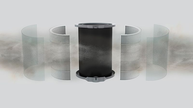 3-шарова фільтрація забезпечує захист від забруднювачів розміром до 0,01 мкм (мікрометра). Перший шар затримує найбільші частинки, такі як волосся та пил. Фільтр HEPA H13 видаляє алергени, пилових кліщів, спори цвілі, бактерії та пил (PM10 і PM2.5). Фільтр з активованим вугіллям поглинає газоподібні забруднювачі (VOC, NO2), сигаретний дим і неприємні запахи.
