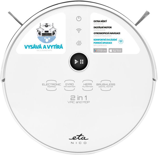 Повністю автоматичний пилосос ETA Nico це практичний помічник, який стане в нагоді в кожному домі. Він не тільки пропилососить всю оселю, але й зробить вологе прибирання підлоги. У його корпусі прихований довговічний цифровий двигун, що забезпечує високу потужність всмоктування. Висока продуктивність супроводжується подвійна фільтрація в тому числі HEPA-фільтр який вловлює навіть найдрібніші частинки пилу. Завдяки потужному акумулятору 14,8 В (3000 мАг) літій-іонному акумулятору 14,8 В (3000 мАг), ETA Nico може прибирати до 140 хвилин на одному заряді. Час прибирання значно скорочується завдяки відмінній орієнтації в просторі. Гіроскопічна навігація забезпечує вибір оптимального маршруту і максимізує ефективність прибирання. Ви можете бути впевнені, що Nico не пропустить жодного куточка у вашому домі.