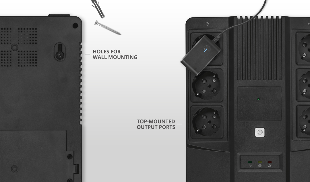 ДБЖ Maxxon легко налаштовується і може використовуватися з електронними пристроями потужністю до 360 Вт, такими як комп'ютер, система домашньої автоматизації, сигналізація, NAS-сервер, маршрутизатор / модем або ігрова приставка. Завдяки зручним верхнім розеткам ДБЖ Maxxon можна розмістити де завгодно: на підлозі, на столі або навіть на стіні.