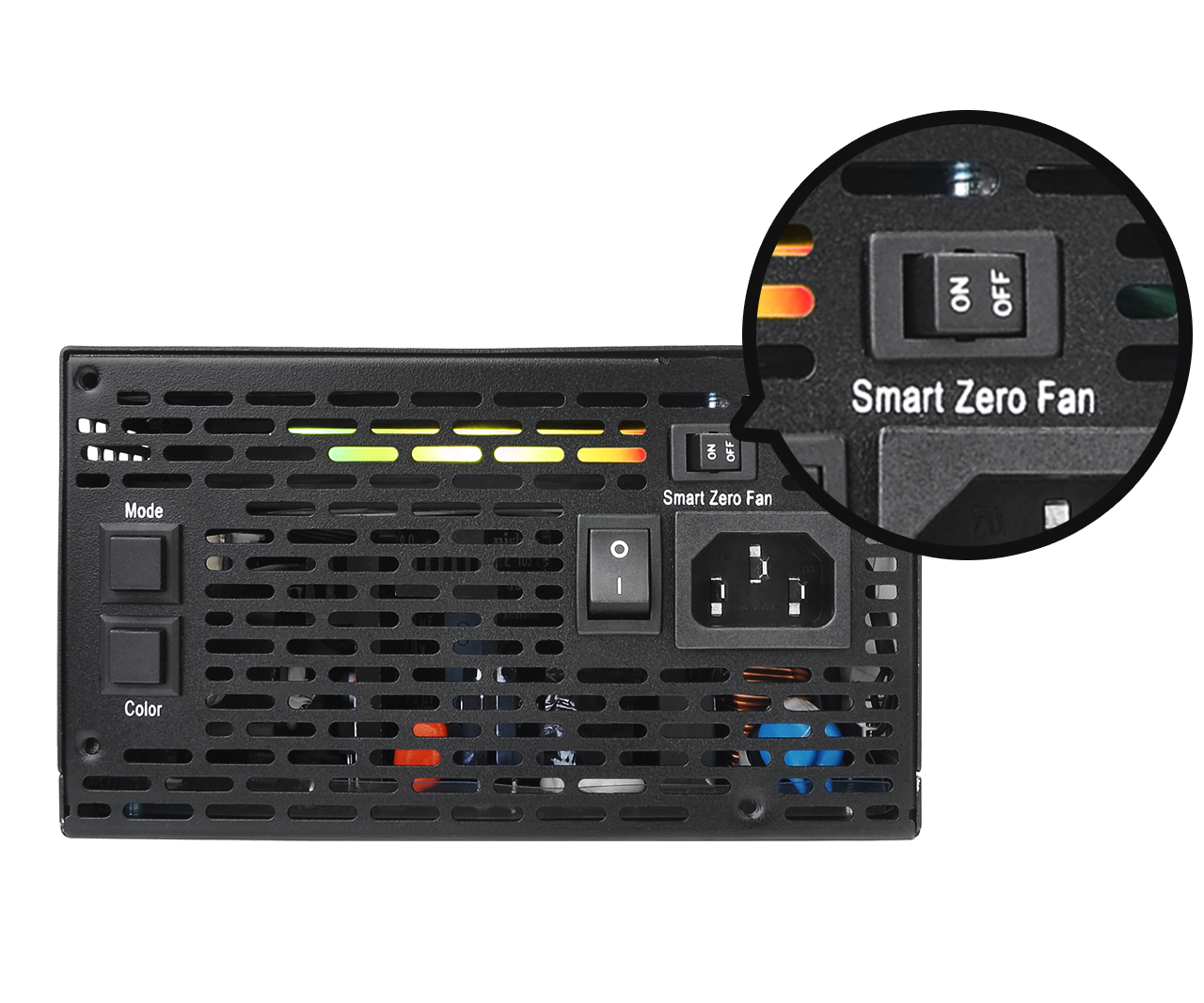 Коли вентилятор Smart Zero вмикається, коли робоче навантаження БЖ перевищує 40%, небажаний шум зводиться до мінімуму. Для тих, хто віддає перевагу безперервному обертанню вентилятора, на задній панелі є зручний перемикач.