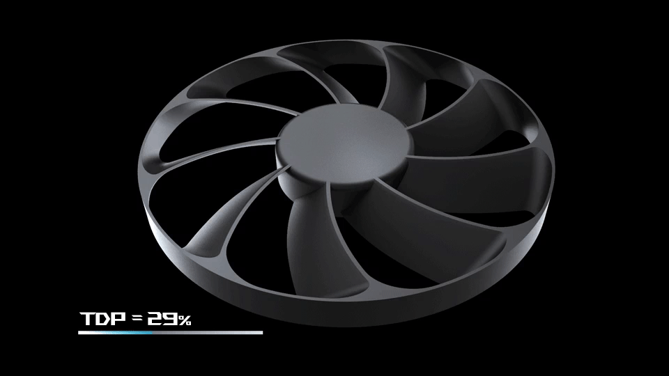 Вбудований контролер зупиняє 135-мм вентилятор, коли теплова розрахункова потужність (TDP) опускається нижче 30%, щоб ви могли насолоджуватися менш вимогливими іграми у відносній тиші. Коли TDP перевищує 30%, вентилятори автоматично перезапускаються.