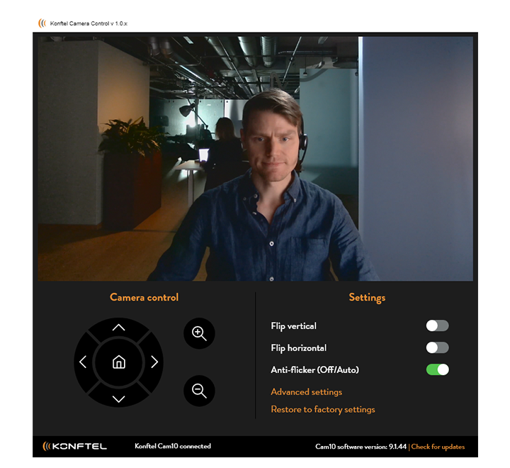Щоб використовувати функцію цифрового зуму на камері Konftel Cam10, завантажте простий додаток для ПК Konftel Camera Control . Як до, так і під час відеозустрічі ви можете збільшувати/зменшувати масштаб, обрізати зображення вгору/вниз і вправо/вліво (ePTZ). Хоча програма проста і зручна у використанні, вона містить цілий набір розширених налаштувань для регулювання характеру зображення і функцій камери. Додаток Konftel Camera Control для ПК підтримує Windows і Mac.