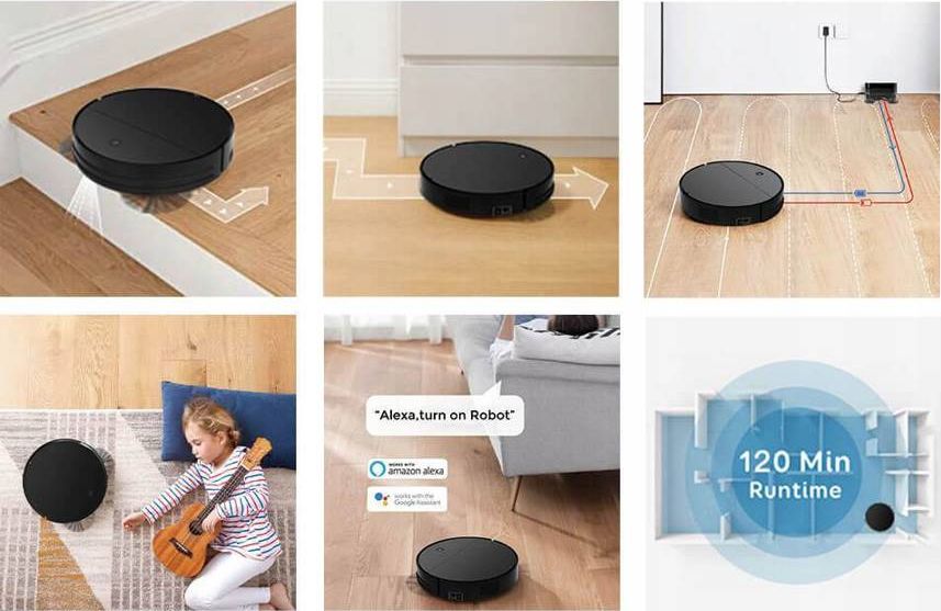 Робот має висока ефективність прибирання, потужність всмоктування регулюється для зменшення рівня шуму. Завдяки компактним розмірам і великій ємності акумулятора 2000 мАг час роботи пристрою досить тривалий: 1,5 - 2 години роботи. Великий контейнер Пилозбірник на 150 мл і резервуар для води на 350 мл підходять для великих квартир. Заміна контейнера для сміття або резервуара для води дуже просто. Просто відкрийте кришку пилососа і вийміть його. Керування керується дистанційно зі смартфона за допомогою Tuya Smart. Він дозволяє стежити за прибиранням, встановлювати режим прибирання або часову програму.