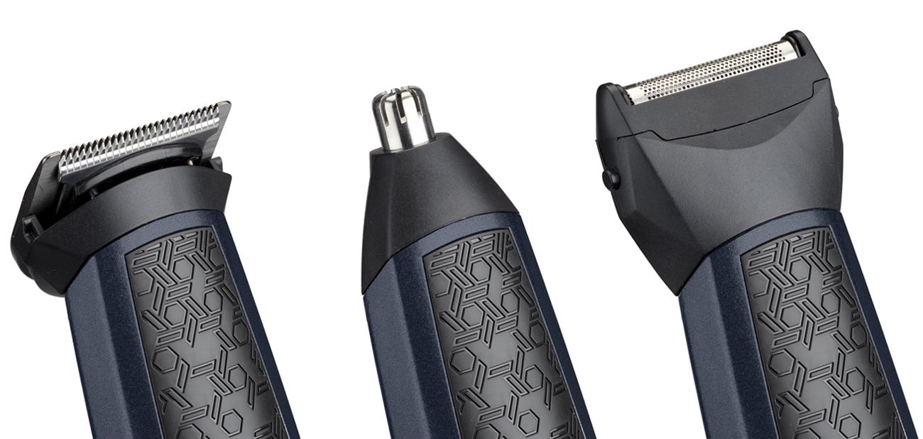 До комплекту входять 4 насадки-гребінці (5-6-7-8 мм) для легкого укладання бороди, регульована насадка для короткої бороди (1 і 3,5 мм), 2 насадки для тіла (3-4 мм), бритва для гоління фольгою, тример для носа, практичний футляр для перенесення, щіточка для чищення та зарядний пристрій.