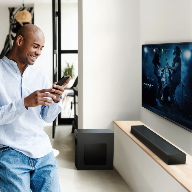 Сабвуфер комплекту HTB490 має потужність 160 Вт і забезпечує бездротове підключення через Bluetooth® - ви можете розташувати його там, де він буде генерувати найкращий звук. Інноваційна конструкція забезпечує захист простору всередині сабвуфера, розсіюючи звук навколо, щоб ви могли по-справжньому відчути його - і бути в центрі подій.