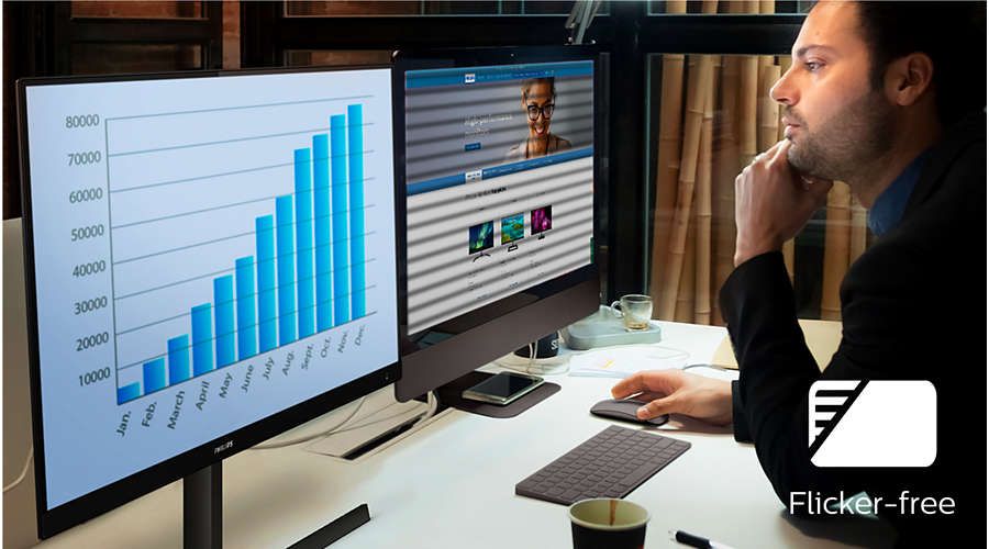 Через те, як регулюється яскравість екранів зі світлодіодним підсвічуванням, деякі користувачі помічають мерехтіння на своїх екранах, що спричиняє втому очей. Технологія Philips Flicker-free використовує нове рішення для регулювання яскравості та зменшення мерехтіння для більш комфортного перегляду.