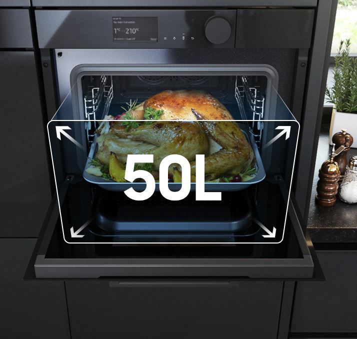 Створюйте все більші і більші страви з величезною 50-літровою духовкою. Духова шафа відкриває більше можливостей на домашній кухні. Ви можете готувати різні страви на різних рівнях, наприклад, овочі, пироги, запіканки або макаронні вироби. У ній можна легко розмістити великі страви, наприклад, велику печеню або індичку.