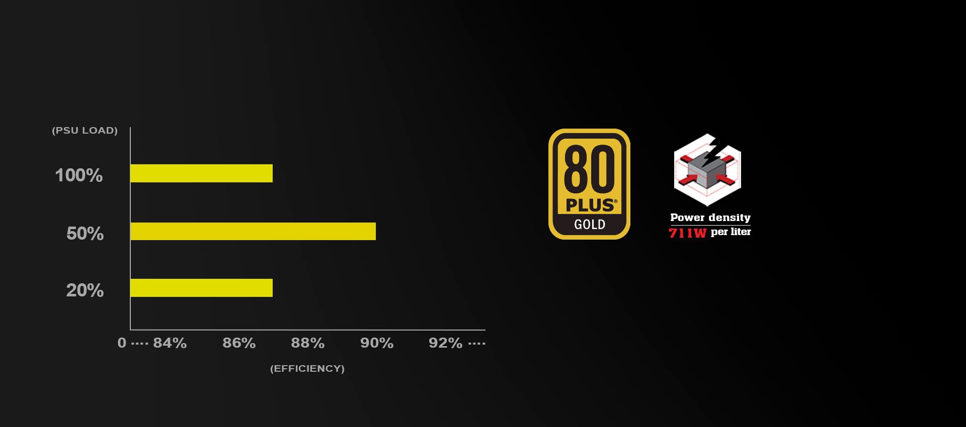 - Висока ефективність Vero M3 700 Вт підтверджена сертифікатом 80 PLUS® Bronze. Виміряна ефективність блоку живлення більш ніж відповідає вимогам стандарту: близько 87% при 20% навантаженні, ~90% при 50% і більше 87% при навантаженні, що дорівнює максимальній потужності блоку живлення.
