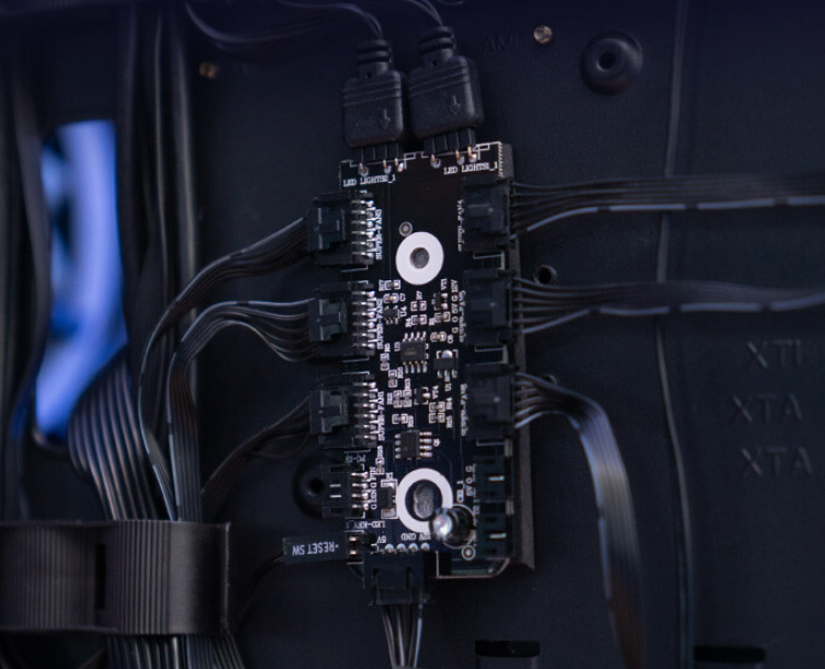 До комплекту поставки входить 6-портовий концентратор з функцією ШІМ-керування, який дозволяє підключити до шести 6-контактних адресних RGB-вентиляторів AeroCool і до двох 3-контактних адресних RGB-пристроїв з роз'ємом ARGB +5 В. Керуйте адресним RGB за допомогою сумісних материнських плат ARGB, зокрема ASUS Aura Sync, MSI Mystic Light Sync і Gigabyte RGB Fusion (з 5-контактним роз'ємом ARGB 5 В).