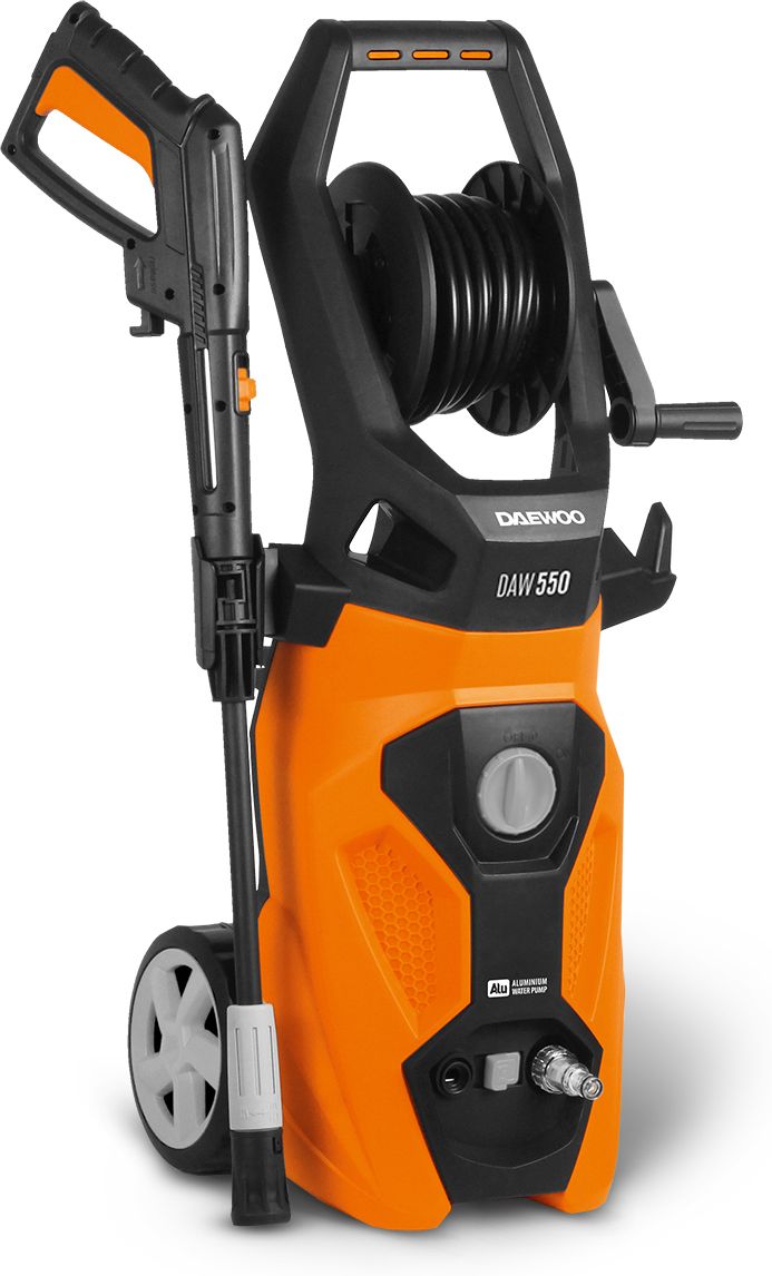 Мийка високого тиску Daewoo DAW 550 оснащений електродвигуном потужністю 2200 Вт і напругою живлення 230 В що дозволяє йому створювати тиск 170 бар з витратою 450 л/год,спеціально розроблений для насосів високого тиску. Агрегат оснащений автоматичним відключенням і незалежним відбором води, а також поворотною насадкою для видалення стійких забруднень і вбудованим піноутворювачем. Вбудований фільтр тонкого очищення захищає мийку та поверхню, що очищується, від дрібних частинок. Тримач для аксесуарів на корпусі дозволяє акуратно зберігати та транспортувати мийку. До комплекту входять шланг високого тиску, котушка зі шлангом, пістолет, розпилювальна насадка, обертова насадка та пінна насадка. та пінну насадку. Контейнер для миючого засобу вбудований в пральну машину, тому немає необхідності зупиняти роботу для заміни насадок. Подачу піни можна активувати за допомогою перемикача на корпусі мийки. Спеціальна насадка, що обертається створює обертовий струмінь води, який гарантує набагато більшу ефективність, ніж віяловий струмінь. Вона чудово видаляє старий, засохлий бруд, а на максимальній потужності може видалити навіть стару фарбу та штукатурку.