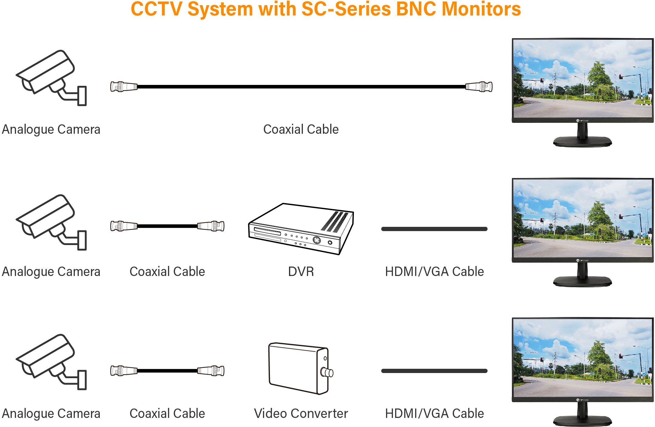 SC-2402 підтримує як аналогові, так і цифрові відеовходи. Легко підключайтеся до різних пристроїв відеоспостереження за допомогою вхідних/вихідних портів HDMI, VGA і BNC. Порт BNC дозволяє підключати камери відеоспостереження безпосередньо до монітора. З цим безрамковим монітором для сектора безпеки немає необхідності в DVR / конвертері для переходу безпосередньо до миттєвого моніторингу.