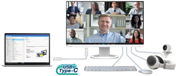 FlexScan EV2490 оснащений роз'ємом USB-C для прийому аудіо-, відео- і USB-сигналів, зарядки підключених пристроїв і навіть передачі мережевого сигналу. Це спрощує і прискорює підключення ноутбука для тих, хто переїжджає між робочими місцями або працює поза офісом.