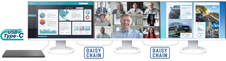 Інтерфейс USB-C підтримує послідовне з'єднання, що дозволяє підключати кілька моніторів до одного джерела сигналу. Таким чином, ви можете створити зручну багатомоніторну систему з чотирма дисплеями.