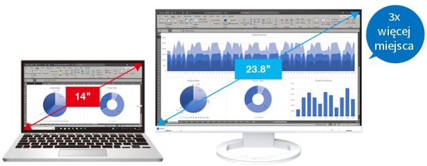 EV2490 має 23,8-дюймову IPS-панель з роздільною здатністю Full HD (1920 x 1080). При підключенні до 14-дюймового ноутбука доступний робочий простір збільшується втричі. Це дозволяє працювати швидше і комфортніше, без необхідності прокручувати вміст екрану або перемикатися між вікнами.