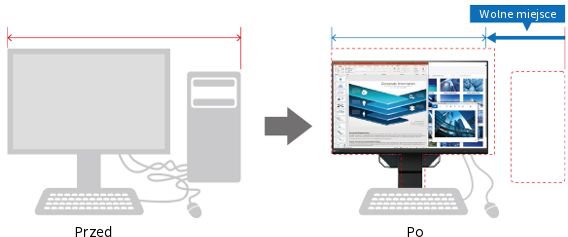 Завдяки компактним розмірам (537,8 мм завширшки та 230 мм завглибшки) монітор легко впишеться в невеликий домашній офіс або спільний простір. Завдяки регулюванню висоти (191,2 мм) монітор можна розмістити над ноутбуком, щоб створити компактну конфігурацію з двома екранами.