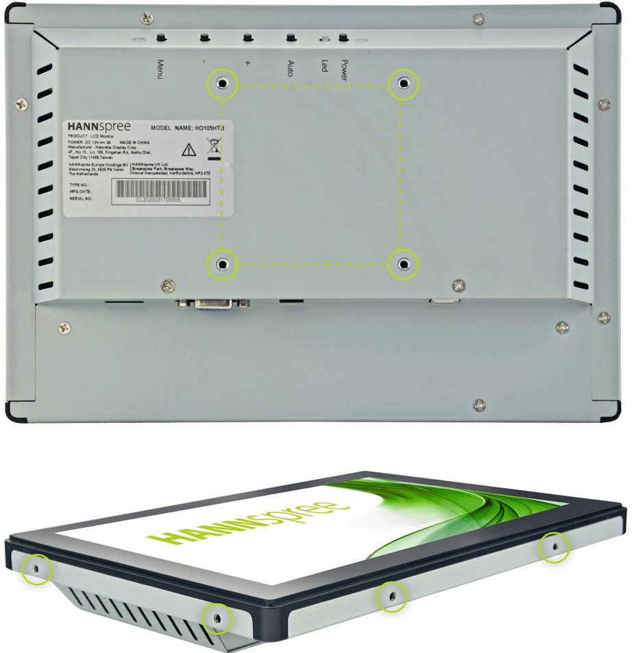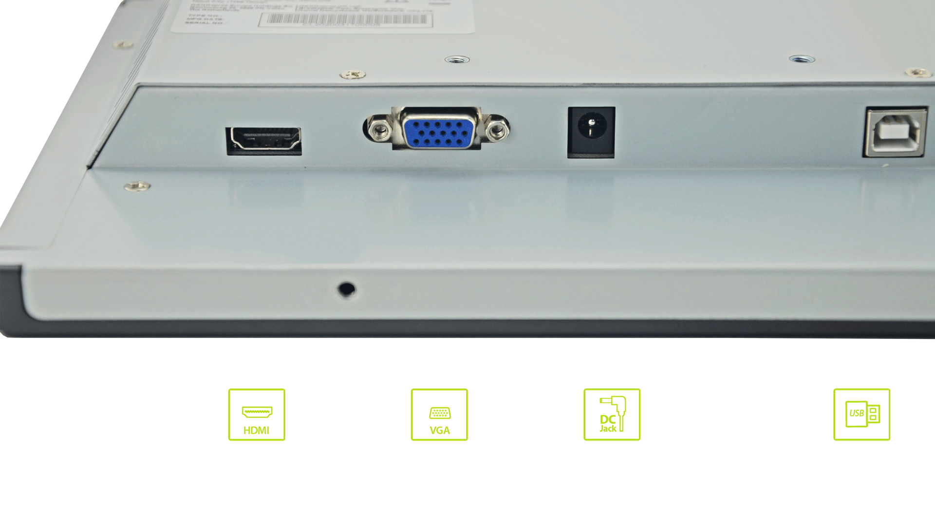 HANNspree HO105HTB пропонує кілька варіантів підключення, включаючи HDMI і VGA. Увімкнути сенсорний екран дуже просто! Просто підключіть USB-кабель від комп'ютера до USB-порту даних монітора і підключіть один з відеовходів, щоб вивести зображення на екран.