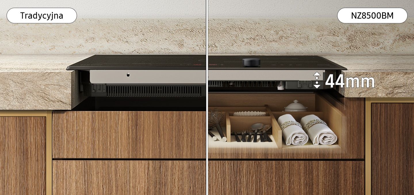 Зменшена товщина індукційної варильної панелі означає додатковий простір для зберігання на кухні. Дизайн варильної поверхні зменшився з 52 мм до 44 мм, тому її можна встановлювати на стільниці різної товщини - від 10 мм. Це також означає, що під варильною поверхнею з'являється більше місця, наприклад, для більшої шухляди для зберігання, а встановлення варильної поверхні та духової шафи під варильною поверхнею стає набагато простішим і дешевшим.