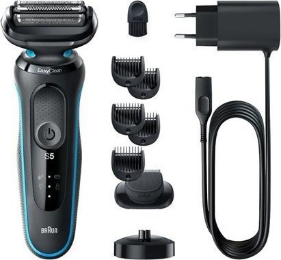 Braun Series 5 51-M4500cs. Система гоління: Бритва з фольгою, Тип управління: Кнопки. Колір виробу: Чорний, Синій, Тип дисплея: LED, Світлодіоди: Зарядка, Живлення. Джерело живлення: Мережа / Акумулятор, Технологія акумулятора: Літій-іонний (Li-Ion), Тип акумулятора: Вбудований акумулятор. Насадка-гребінець: Тіло. Тип упаковки: Коробка