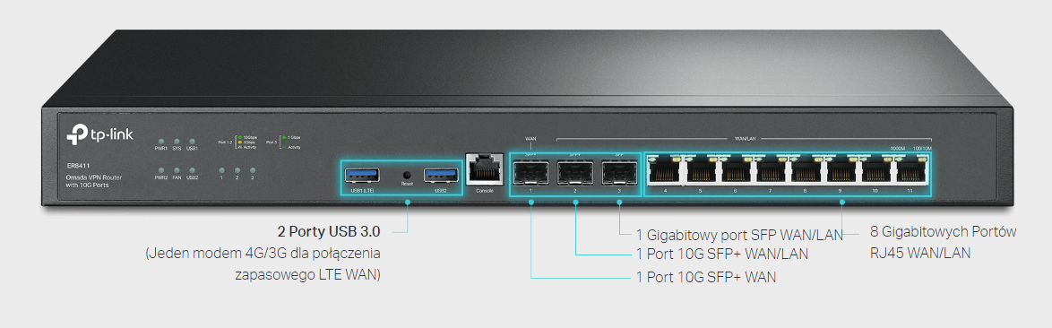 До 10 доступних портів SFP+, SFP і RJ45 WAN дозволяють маршрутизатору підтримувати різноманітні підключення до Інтернету. Функція балансування пропускної здатності декількох WAN-портів розподіляє потоки даних на основі співвідношення пропускної здатності кожного WAN-порту, щоб підвищити ефективність використання багатоканального з'єднання. Підключіть 4G/3G-модем до одного з портів USB 3.0 для створення резервного каналу WAN LTE.