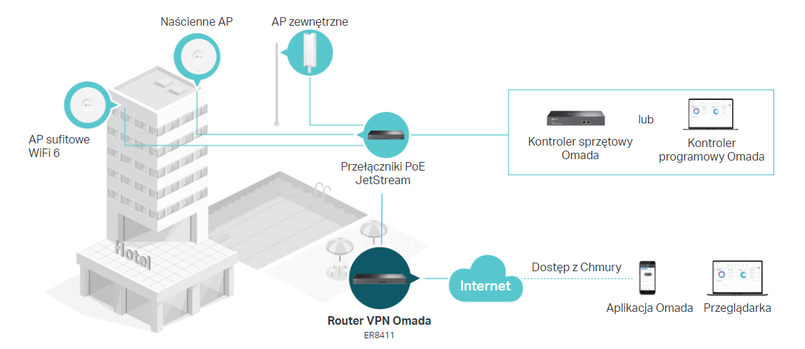 Платформа Omada Software Defined Networking (SDN) об'єднує мережеві пристрої, такі як точки доступу, комутатори і маршрутизатори, разом, забезпечуючи 100% централізоване хмарне управління і високомасштабовану мережу, керовану з одного інтерфейсу.