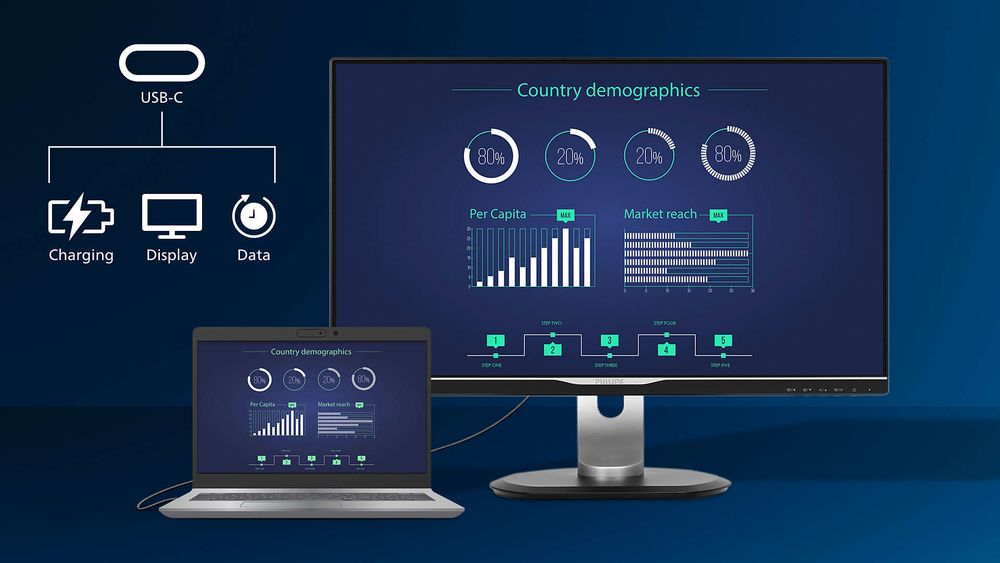 Цей монітор Philips має вбудований роз'єм USB Type C з функцією живлення. Завдяки розумному та гнучкому керуванню живленням ви можете безпосередньо заряджати сумісний пристрій. Тонкий двосторонній роз'єм USB-C дозволяє легко підключати пристрої за допомогою одного кабелю. Ви можете одночасно переглядати відео високої чіткості та швидко передавати дані, а також живити або заряджати сумісний пристрій.