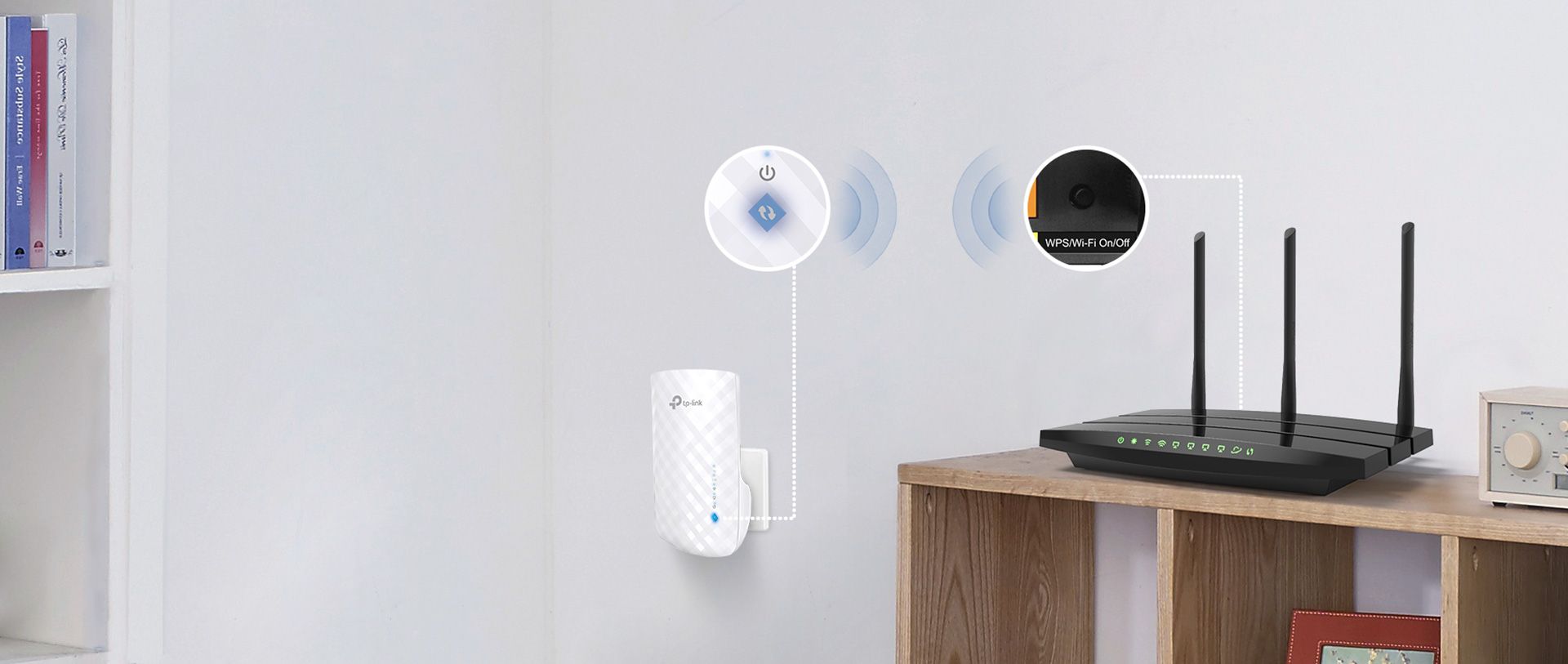 Щоб підключитися до мережі, достатньо натиснути кнопку WPS на маршрутизаторі, а потім, протягом двох хвилин, кнопку RE на підсилювачі. І все! Після підключення до роутера ви можете переміщати підсилювач у будь-яке місце в межах зони дії бездротової мережі.